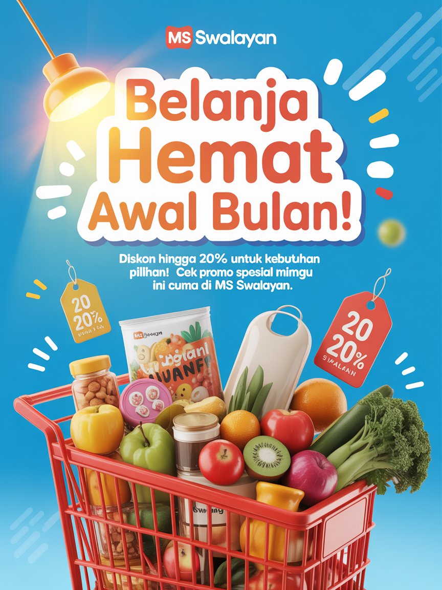 Saatnya isi kembali kebutuhan bulananmu dengan promo spesial dari MS Swalayan! Nikmati diskon hingga 20% untuk berbagai produk kebutuhan pilihan, mulai dari bahan makanan segar, camilan, hingga perlengkapan rumah tangga. Belanja cerdas dan hemat di awal bulan, hanya di Plaza UNY.
